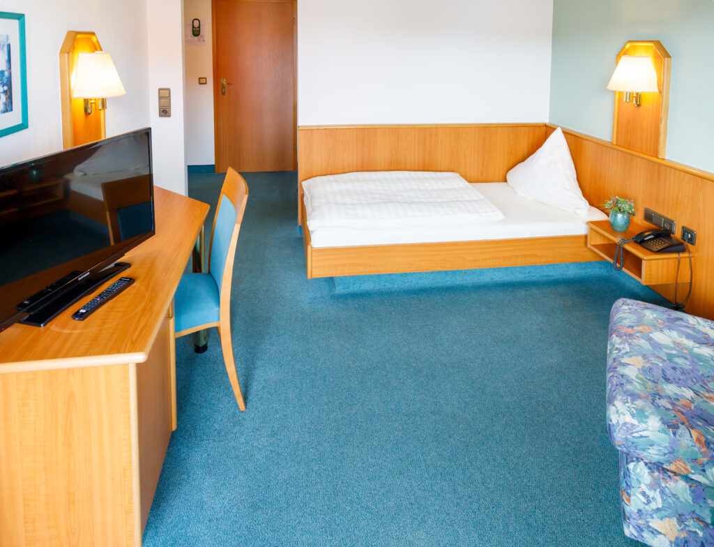 Einzelzimmer Gemütlich eingerichtetes Einzelzimmer zum ruhig gelegenen Hinter- bzw. Innenhof ca. 20m² Bett (90cm x 200cm) Flachbild Sat-TV, gratis WLAN Badezimmer mit Dusche und WC Balkon Preise: ab 64 Euro ohne Frühstück
